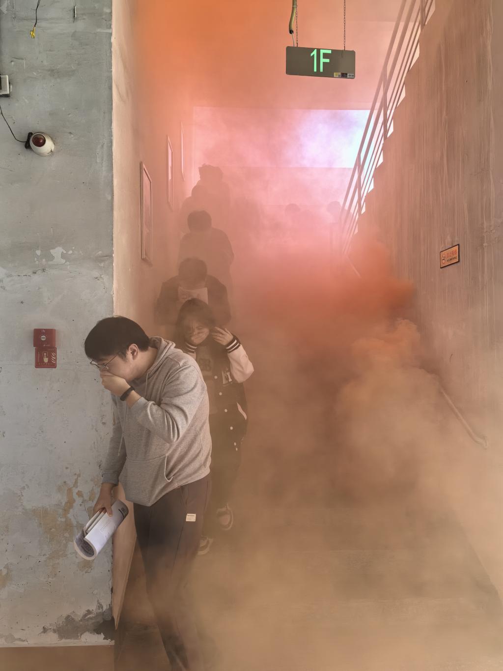 第二部分應(yīng)急逃生演練(消防、地震)。演練開啟前安全工作處林澤文先詳細(xì)介紹消防器材的使用、演練程序、疏散信號、疏散路線、疏散順序等注意事項(xiàng),并強(qiáng)調(diào)在疏散過程中切勿擁擠、推搡導(dǎo)致踩踏事件發(fā)生。演練工作組接到演練指令后,燃放煙霧,平靜的醫(yī)工學(xué)院樓突然黃煙四起、警報(bào)鈴響,各位老師迅速到達(dá)指定崗位,學(xué)生們也隨之做出反應(yīng),在現(xiàn)場人員的指揮下,學(xué)生們紛紛用手、濕紙巾等捂住口鼻,彎著腰從預(yù)定的逃生路線進(jìn)行撤離,撤退中所有同學(xué)緊靠右行,撤退過程井然有序,參加本次演練師生全部安全撤離到指定區(qū)域。