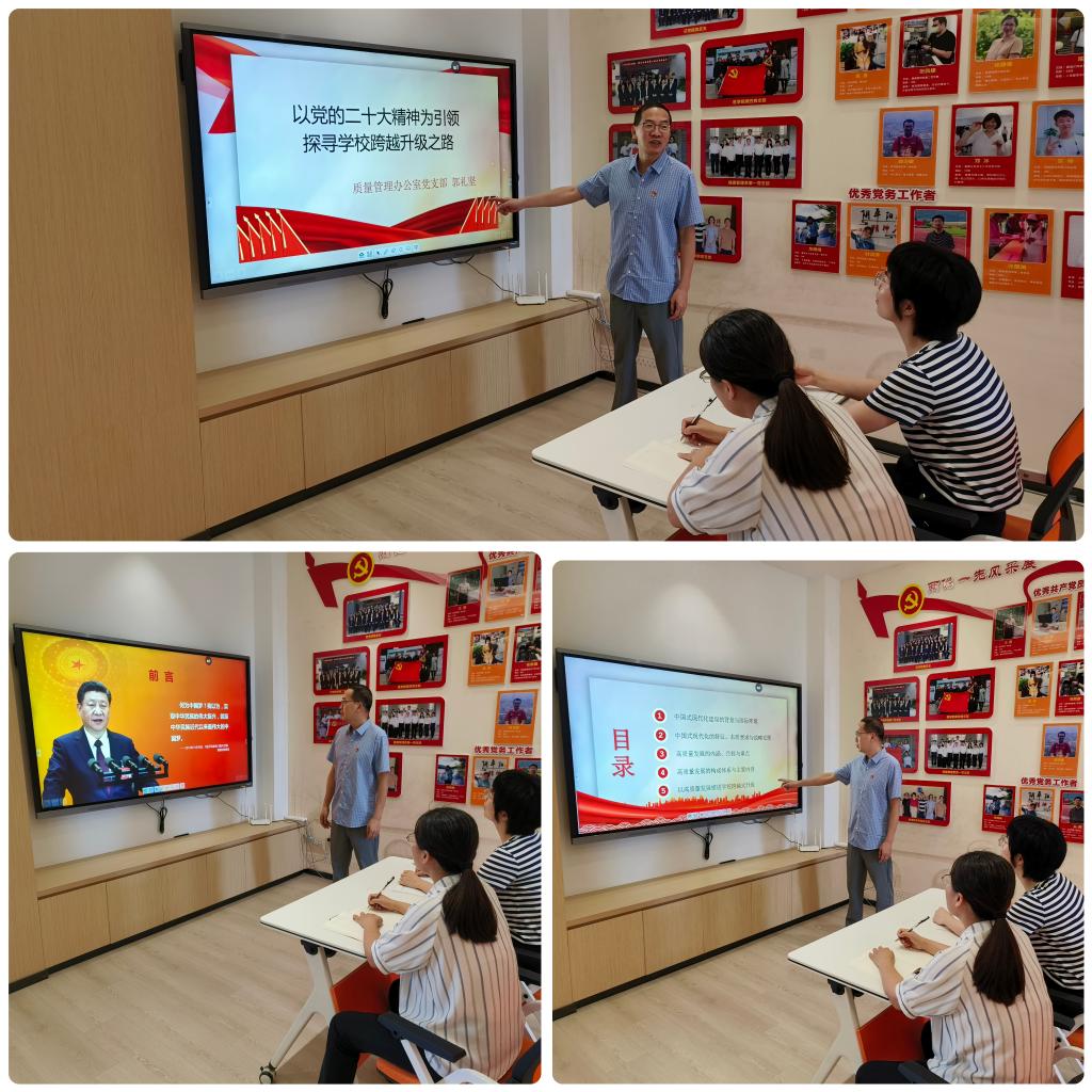 為深入學(xué)習(xí)貫徹習(xí)近平新時代中國特色社會主義思想和黨的二十大精神,2023年5月22日下午,質(zhì)量管理辦公室黨支部書記郭禮堅在學(xué)校黨員活動室為支部黨員開展了支部書記講黨課活動。