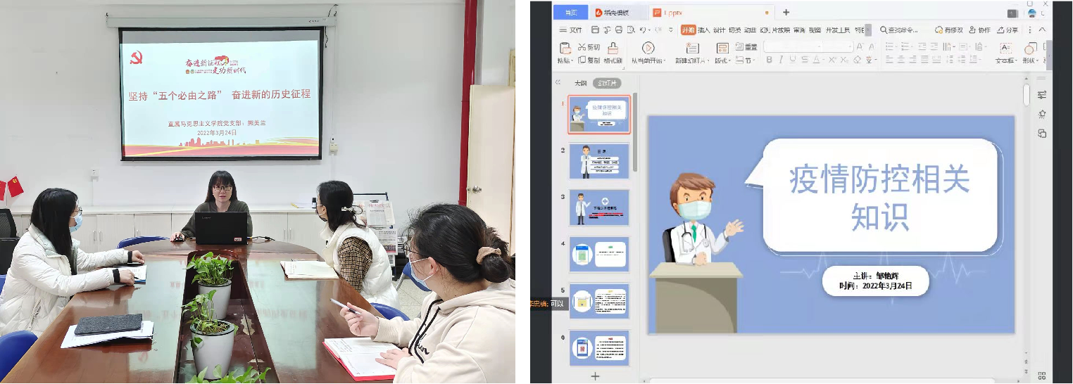 黨員教師們將偉大的抗疫精神融入黨性教育中,將疫情時刻的危機轉(zhuǎn)化為課程思政的契機。直屬馬克思主義學(xué)院黨支部書記熊美蘭為全體黨員教師開講《堅持“五個必由之路”奮進新的歷史征程》主題黨課,并通過課程集備,討論在課堂內(nèi)容中充分融入抗疫素材,將抗疫先進事跡和理想信念教育有機融合,同時對學(xué)生做好心理疏導(dǎo)和正面引導(dǎo),鼓勵學(xué)生以積極的態(tài)度同心戰(zhàn)“疫”。藥學(xué)院第一黨支部結(jié)合疫情防控工作組織線上黨日活動,開展“抗擊疫情 奉獻有我”防疫宣講,并聯(lián)合藥學(xué)院團總支舉辦防疫知識競賽送香囊活動,通過活動引導(dǎo)學(xué)生樹立“從我做起,積極防疫”的意識,肩負(fù)起疫情防控的使命。