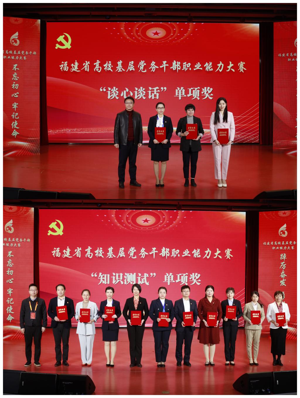 全省高?;鶎狱h務(wù)干部職業(yè)能力大賽分三個(gè)階段,第一階段設(shè)“知識(shí)測(cè)試”“主題黨日策劃”兩個(gè)賽項(xiàng);第二階段設(shè)“微黨課”賽項(xiàng);第三階段設(shè)“談心談話”賽項(xiàng)。我校在三個(gè)階段比賽中均表現(xiàn)優(yōu)異,其中,黃玲云老師榮獲“談心談話”賽項(xiàng)全省第一名、“知識(shí)測(cè)試”賽項(xiàng)全省第二名 ,劉丹丹老師榮獲“微黨課”賽項(xiàng)全省第四名,團(tuán)隊(duì)總成績(jī)最終榮獲高職組全省第二名。