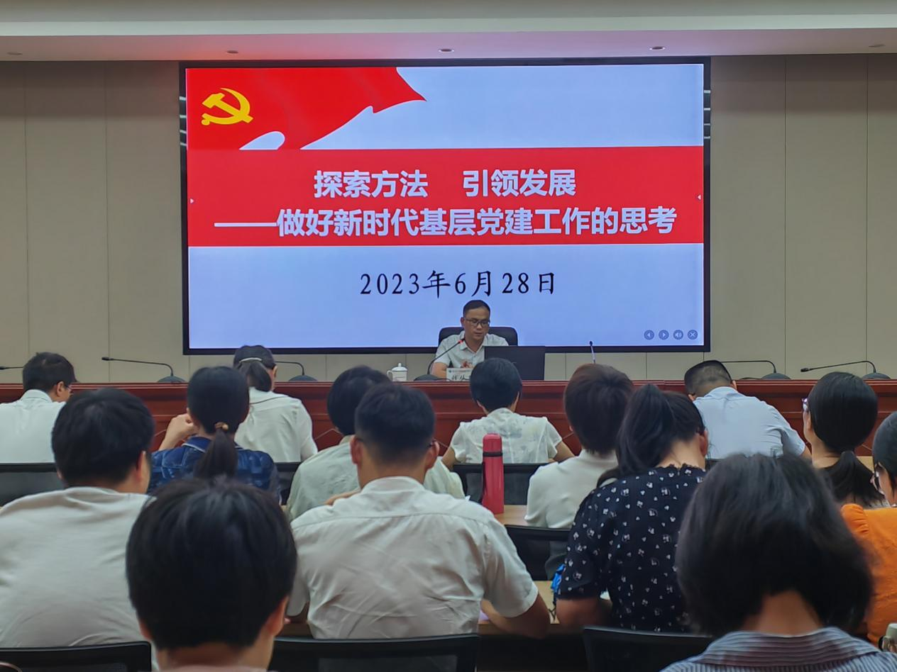 錢從明老師以《探索方法 引領(lǐng)發(fā)展——做好新時(shí)代基層黨建工作的思考》為題,從發(fā)展黨員工作中常見問題與困惑、如何總結(jié)凝練基層黨建工作經(jīng)驗(yàn)和做好新時(shí)代黨建工作的實(shí)踐思考三個(gè)方面對黨建工作進(jìn)行了全面的梳理和指導(dǎo)。他結(jié)合發(fā)展黨員專項(xiàng)檢查中遇到的問題、黨建項(xiàng)目申報(bào)優(yōu)秀案例等為例,對黨建工作實(shí)務(wù)進(jìn)行了詳細(xì)的講解,并從“勤學(xué)習(xí)、重思考、善作為、求創(chuàng)新”四個(gè)角度對黨務(wù)干部做好新時(shí)代基層黨建工作提供了建議。最后,與會黨務(wù)干部針對黨建雙創(chuàng)、支部立項(xiàng)、發(fā)展黨員等工作中遇到的實(shí)際問題與錢老師開展了現(xiàn)場交流。