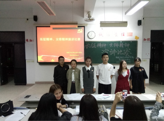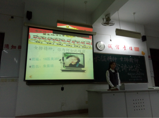 為傳承長征精神與奧運(yùn)女排的拼搏精神,營造良好的校園文化氛圍。10月30日晚7點管理系學(xué)生會在教學(xué)樓209教室舉辦以“自強(qiáng)不息,百折不撓”為主題的演講比賽,9名選手參賽。