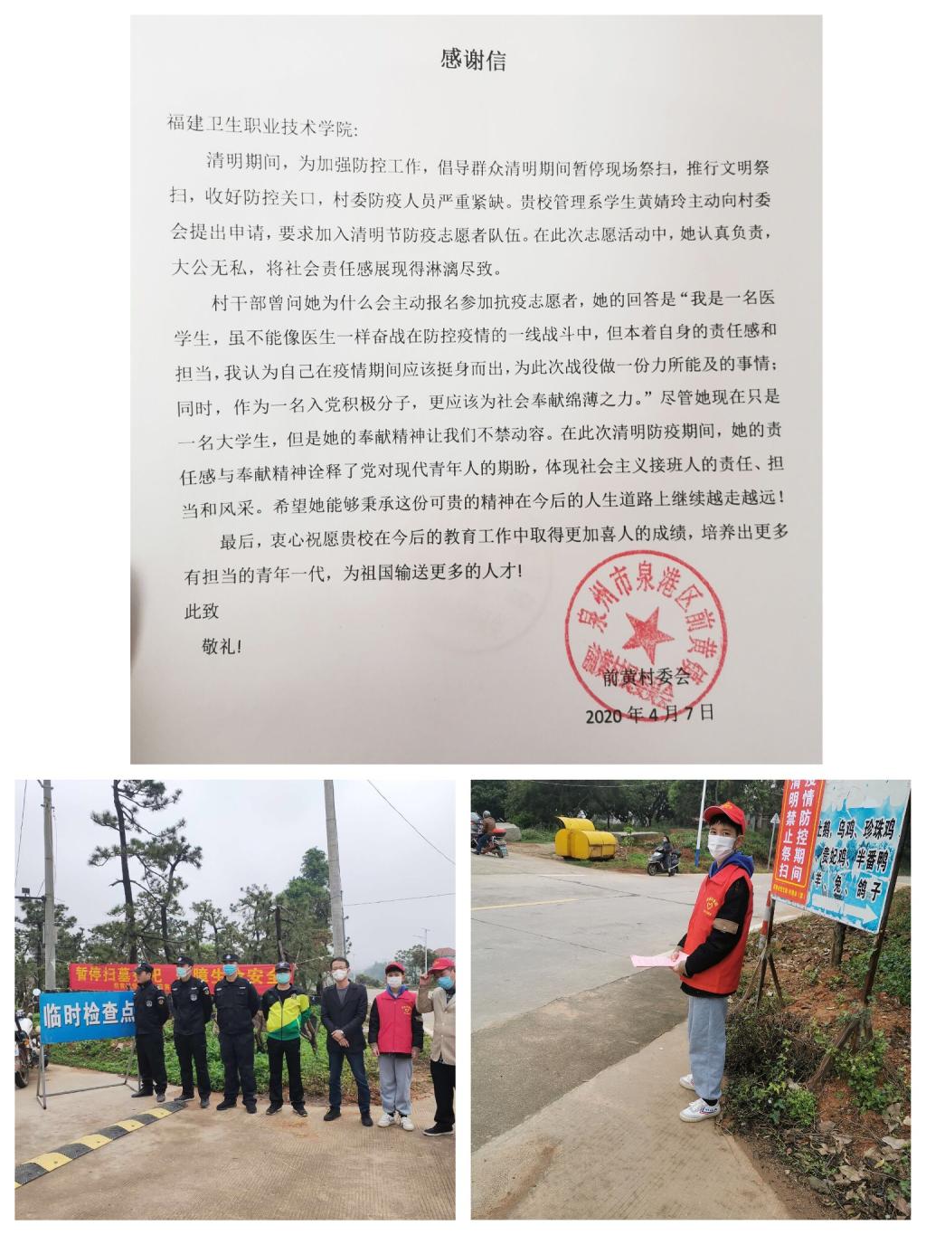 近日,我系收到了福建省泉州市泉港區(qū)前黃村委會的感謝信,感謝健康管理系19健管302班黃婧玲同學(xué)清明節(jié)期間在本村委防疫人員嚴(yán)重緊缺的情況下,積極響應(yīng)國家號召,主動(dòng)請纓,志愿成為泉州市泉港區(qū)防疫志愿者中的一員。