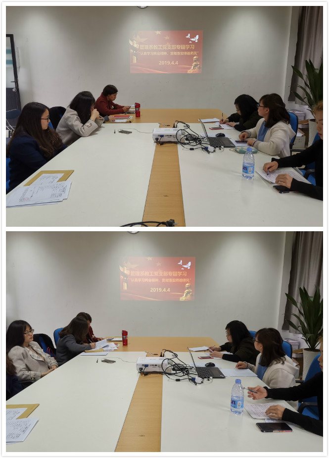 為進(jìn)一步傳達(dá)、學(xué)習(xí)2019年全國兩會精神,加強(qiáng)系部師德師風(fēng)建設(shè),管理系教工黨支部舉行“認(rèn)真學(xué)習(xí)兩會精神,貫徹落實師德師風(fēng)建設(shè)”專題學(xué)習(xí)。此次學(xué)習(xí)由教工黨支部組織委員兼紀(jì)檢委員王國浩同志組織。