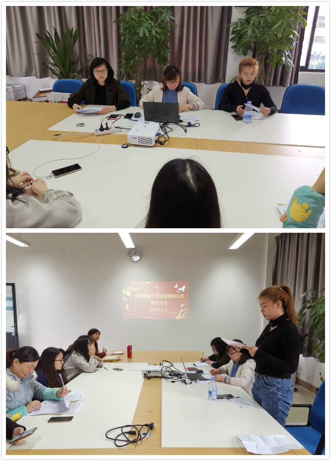 4月4日,管理系教工黨支部舉行預(yù)備黨員轉(zhuǎn)正大會(huì),大會(huì)討論并審議預(yù)備黨員朱紫瓊(16美容301)同志轉(zhuǎn)為正式黨員問題,全體支部黨員參加會(huì)議。