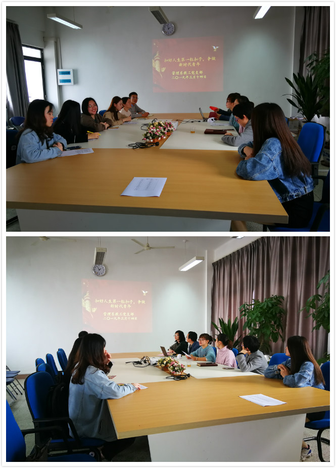 為了深入學(xué)習(xí)宣傳貫徹習(xí)近平新時代中國特色社會主義思想和黨的十九大精神,牢記總書記關(guān)于“扣好人生第一??圩印钡慕虒?dǎo),2019年3月14日,管理系教工黨支部開展“扣好人生第一粒扣子,爭做新時代青年”主題黨日活動。此次活動由教工黨支部書記馮瑞華同志主持。