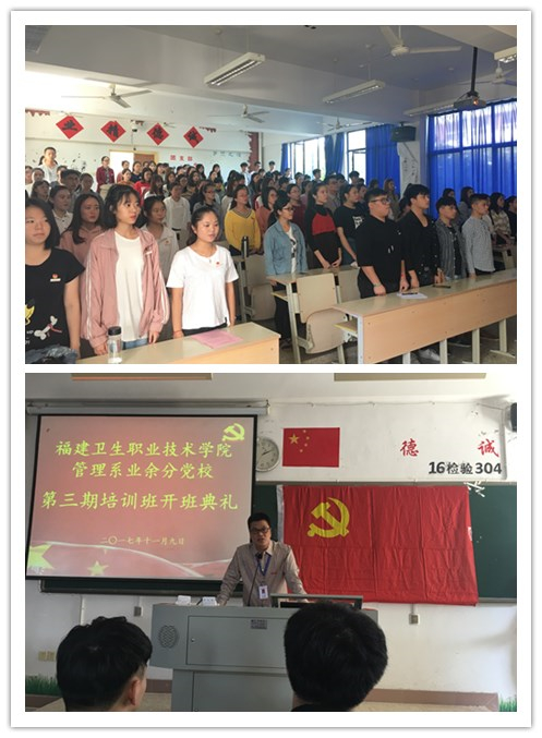 11月9日下午,管理系在教學(xué)樓314教隆重舉行第三期業(yè)余分黨校培訓(xùn)班開班典禮。管理系黨總支副書記艾松軍,黨總支紀(jì)檢委員陳盛蘭,黨總支組織委員、學(xué)生黨支部書記揭金花,教工黨支部書記、團(tuán)總支書記邱麟,學(xué)生黨支部組織委員李丹,團(tuán)總支副書記馮瑞華,輔導(dǎo)員詹燕婷以及系團(tuán)學(xué)干部、入黨積極分子及部分先進(jìn)分子參加了開班典禮。