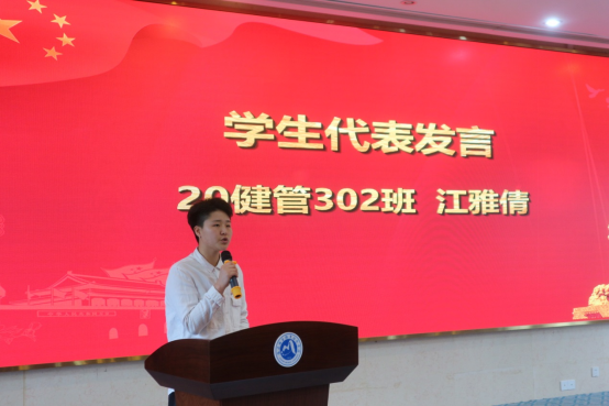 隨后,由本期學(xué)員代表20健管302班江雅倩同學(xué)上臺(tái)發(fā)言,江雅倩同學(xué)表示,作為新時(shí)代的先進(jìn)青年、先進(jìn)大學(xué)生,我們應(yīng)該從自身做起:在生活中嚴(yán)格要求自己;不斷加強(qiáng)科學(xué)文化知識(shí)的學(xué)習(xí),提高自己的人文素養(yǎng),掌握為人民服務(wù)的本領(lǐng);同時(shí)提升文化自信,進(jìn)入社會(huì)后,能將自己的所學(xué)應(yīng)用到工作實(shí)踐中,要積極響應(yīng)國(guó)家的號(hào)召,獻(xiàn)出自己的綿薄之力。
