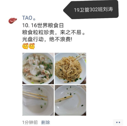 黨員同志們紛紛參與活動(dòng),用身體力行做到“光盤行動(dòng)”,通過曬朋友圈的方式積極推廣,讓更多的大學(xué)生了解節(jié)糧愛糧、健康飲食的重要性,從自身做起,發(fā)揮新時(shí)代弄潮兒的影響力,積極營(yíng)造厲行節(jié)約、反對(duì)浪費(fèi)的濃厚氛圍,讓珍惜食物的意識(shí)不斷深入人心,活動(dòng)取得了不錯(cuò)的反響。