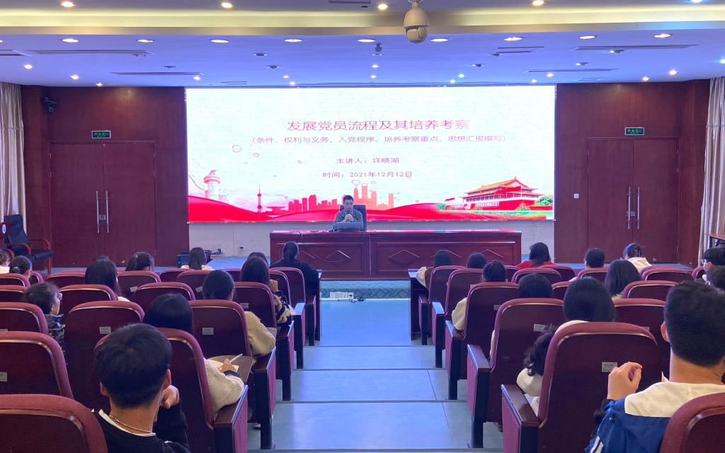 為使入黨積極分子更加了解中國共產(chǎn)黨黨員發(fā)展流程及其培養(yǎng)考察的內(nèi)容,2021年12月12日晚上健康管理系業(yè)余分黨校第八期培訓(xùn)班暨青馬工程培訓(xùn)班第二課在實(shí)訓(xùn)樓四樓報(bào)告廳舉行。本次授課由健康管理系專職組織員許曉湖主講,為同學(xué)們帶來了一次精彩生動的黨課。