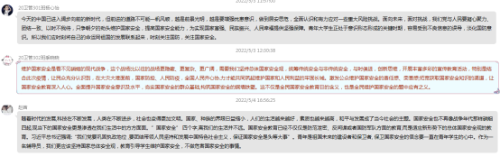 教師黨員趙茜同志表示,青年是祖國未來的建設(shè)者和保衛(wèi)者, 保衛(wèi)國家安全的信念要一直在青年學(xué)生的心中。作為一名輔導(dǎo)員,我們更應(yīng)該堅持國家總體安全觀,教育引導(dǎo)學(xué)生維護(hù)國家安全,不做危害國家安全的事情。
