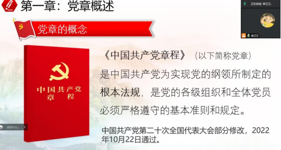 為學(xué)習(xí)貫徹習(xí)近平新時(shí)代中國特色社會(huì)主義思想,深入了解《中國共產(chǎn)黨章程》,2月2日下午,健康管理系第九期分黨校青馬培訓(xùn)班第二課:學(xué)習(xí)中國共產(chǎn)黨章程,全體成員于通過線上舉行,健康管理系團(tuán)總支副書記李江江主講。