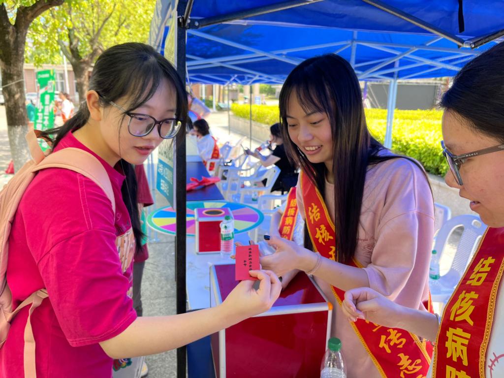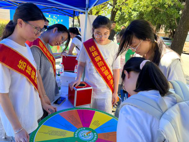 為鞏固同學們對結核病防治核心知識的掌握,并提升他們對結核病的關注與重視,健康學院的預防醫(yī)學專業(yè)教師指導同學們開展了一系列專業(yè)實踐活動。通過設置結核病大轉(zhuǎn)盤游戲、將結核病知識整理成卡片以及設置結核病留言板等趣味活動,增加了互動性和趣味性。在面對同學們回答錯誤或不理解的問題時,結核病志愿者進行針對性的講解,有效促進了大家對結核病知識的理解,極大地喚起了同學們對結核病的重視。