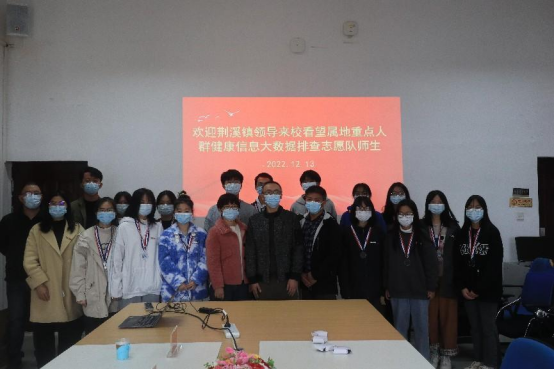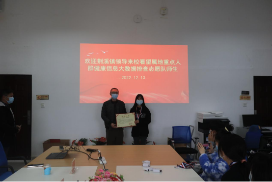 2022年12月13日荊溪鎮(zhèn)政府陳文碩副鎮(zhèn)長來我校看望屬地重點(diǎn)人群健康信息大數(shù)據(jù)排查志愿隊(duì)師生并給志愿隊(duì)師生頒發(fā)獎狀。