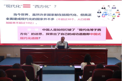 許能鋒從“賡續(xù)初心:接續(xù)奮斗實(shí)現(xiàn)中國(guó)式現(xiàn)代化”“學(xué)深悟透:科學(xué)把握中國(guó)式現(xiàn)代化的重要特征”、“奮楫篤行:以青春之力為中國(guó)式現(xiàn)代化著筆增色”的三大進(jìn)行詳細(xì)闡述,通過(guò)豐富的史料、精煉的理論、生動(dòng)的事例,回顧了中國(guó)共產(chǎn)黨帶領(lǐng)全國(guó)各族人民,實(shí)現(xiàn)了從站起來(lái)到富起來(lái)再到強(qiáng)起來(lái)的偉大飛躍,迎來(lái)了實(shí)現(xiàn)偉大復(fù)興的光明前景。強(qiáng)調(diào)中國(guó)式現(xiàn)代化是我們黨領(lǐng)導(dǎo)全國(guó)各族人民在長(zhǎng)期探索和實(shí)踐中歷經(jīng)千辛萬(wàn)苦、付出巨大代價(jià)取得的重大成果,我們必須倍加珍惜、始終堅(jiān)持、不斷拓展和深化。