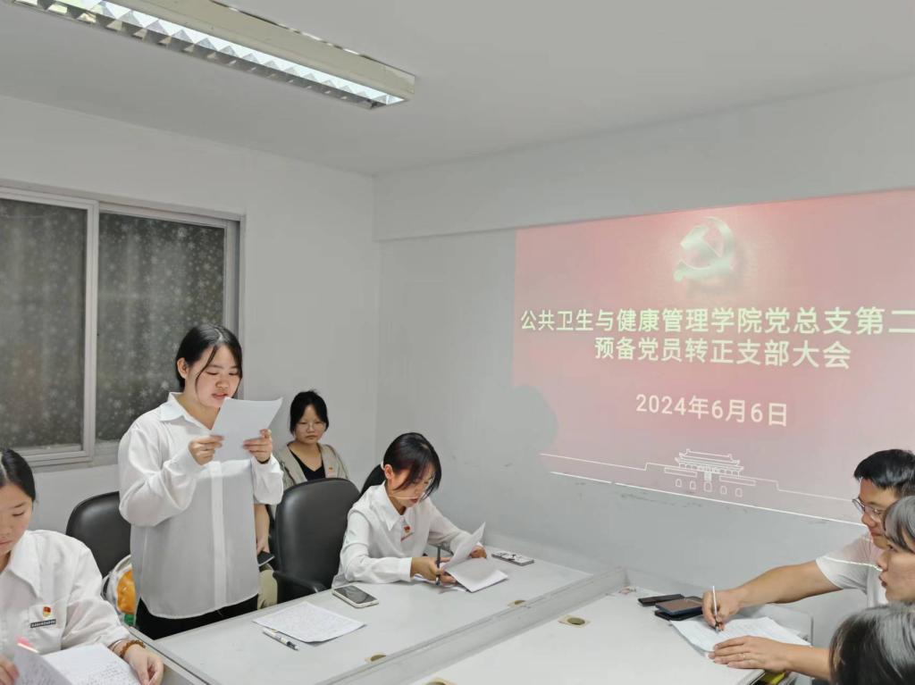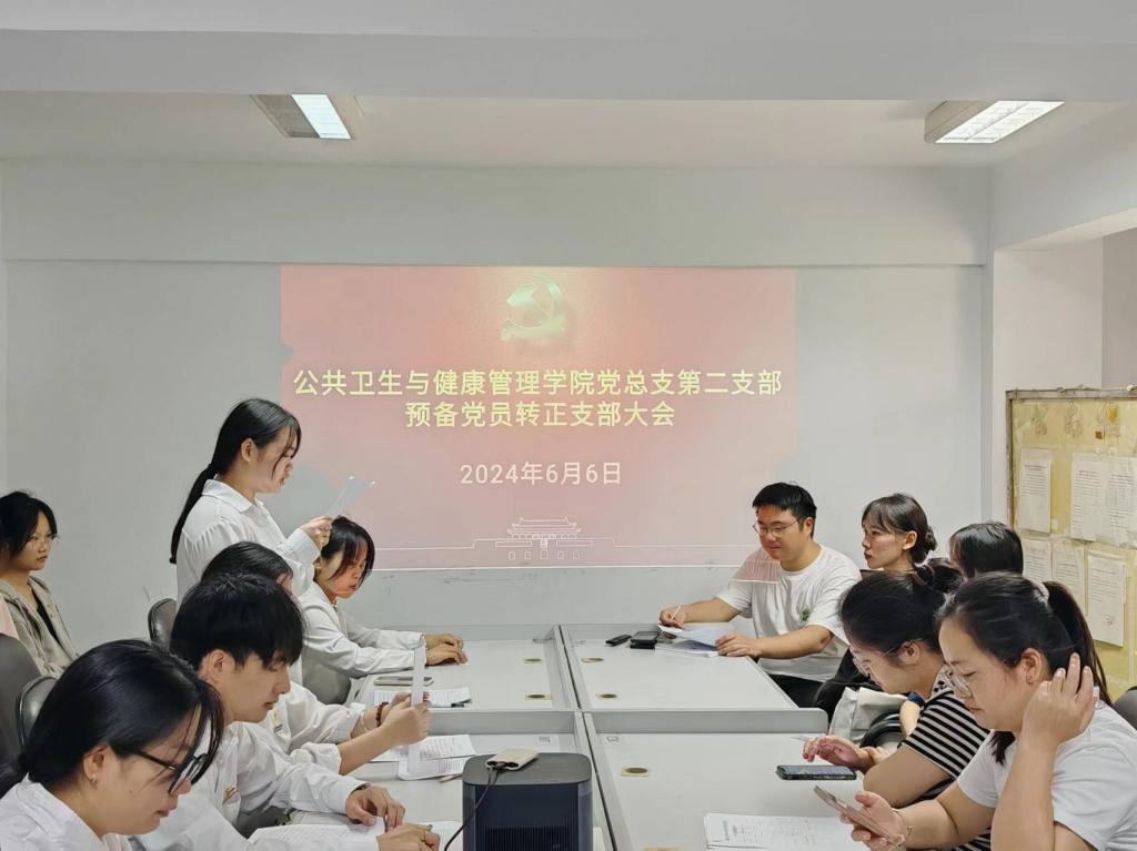 6月6日,公共衛(wèi)生與健康管理學(xué)院黨總支第二支部在學(xué)院會議室隆重召開了預(yù)備黨員轉(zhuǎn)正大會,會議主要討論并審議了張藝銘7名預(yù)備黨員轉(zhuǎn)為正式黨員的申請。會議由黨支部書記張凱捷同志主持,支部全體黨員參加了此次大會。