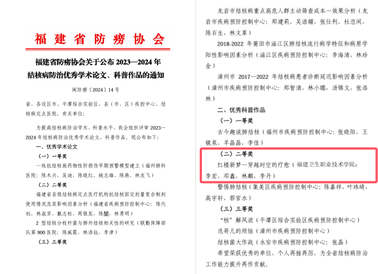 近日,福建防癆協(xié)會(huì)舉辦的2023—2024年全省結(jié)核病防治優(yōu)秀學(xué)術(shù)論文、科普作品征集大賽結(jié)果揭曉,由公共衛(wèi)生與健康管理學(xué)院李宏、鄧鑫、林麒、李丹四位老師指導(dǎo)等李金妹、林曉彤、楊紫瑩、賴宇康、夏念喆、何偉祥、趙舒歆、鄭恩情同學(xué)共同完成的作品《紅樓新夢—穿越時(shí)空的療愈》榮獲二等獎(jiǎng)!