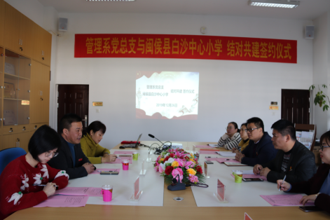 為推動(dòng)城鄉(xiāng)教育均衡發(fā)展,服務(wù)鄉(xiāng)村振興戰(zhàn)略,助力脫貧攻堅(jiān),12月26日上午,管理系黨總支與白沙中心小學(xué)結(jié)對(duì)共建簽約儀式在管理系會(huì)議室舉行。白沙中心小學(xué)校長(zhǎng)李維銓、副校長(zhǎng)林昌芳、德育處主任陳秀金、德育處副主任夏林萍、學(xué)院黨委委員、陳貞健副校長(zhǎng)、管理系黨總支書(shū)記艾松軍、管理系主任莊海林、管理系黨總支紀(jì)檢委員、辦公室主任李淼淼、管理系黨總支專職組織員張?jiān)葡?、管理系黨總支宣傳委員、第一黨支部副書(shū)記揭金花、第二黨支部書(shū)記、團(tuán)總支書(shū)記馮瑞華、管理系團(tuán)總支副書(shū)記趙茜參加會(huì)議。會(huì)議由管理系黨總支書(shū)記艾松軍主持。
