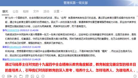 馬主任在解讀文件的基礎(chǔ)上,增加了自己的見(jiàn)解,形象生動(dòng)的為我們上了一堂課,使我們受益匪淺。觀看完講座后,支部黨員積極發(fā)言,在線討論,發(fā)表觀后感。管理系第一黨支部副書(shū)記揭金花老師表示通過(guò)馬陸亭主任對(duì)黨的十九屆四中全會(huì)精神從教育角度解讀,教育制度完善定型的根本目的是培養(yǎng)人,引導(dǎo)我們對(duì)高職教育的深入思考,培養(yǎng)什么人、怎樣培養(yǎng)人、為誰(shuí)培養(yǎng)人,在具體的教育教學(xué)活動(dòng)中更要注重素質(zhì)教育,特別重視學(xué)生的社會(huì)責(zé)任感、創(chuàng)新精神和實(shí)踐能力培養(yǎng)。立德樹(shù)人是綜合概念,是根本任務(wù),以德為先,能力為重,培養(yǎng)德智體美勞全面發(fā)展的人才,為人民服務(wù)。德育作為醫(yī)學(xué)人才培養(yǎng)的首要內(nèi)容,將思想政治教育和醫(yī)學(xué)職業(yè)素養(yǎng)教育貫穿人才培養(yǎng)全過(guò)程,更要以此次疫情防控斗爭(zhēng)中廣大醫(yī)務(wù)工作者為榜樣教育學(xué)生,著力培養(yǎng)學(xué)生“珍愛(ài)生命、大醫(yī)精誠(chéng)”的救死扶傷精神,引導(dǎo)學(xué)生將預(yù)防疾病、解除病痛和維護(hù)群眾健康作為自己的神圣職責(zé)。能力為重培養(yǎng)具有仁術(shù)的醫(yī)學(xué)人才。要把醫(yī)學(xué)生崗位勝任能力培養(yǎng)作為改革重點(diǎn),以高水平的臨床實(shí)踐體系建設(shè)促進(jìn)醫(yī)學(xué)生在實(shí)踐中練就過(guò)硬本領(lǐng)。溫曉黛老師表示教育制度的改革不是一蹴而就的,要有步驟有計(jì)劃,根據(jù)學(xué)生特點(diǎn),逐步過(guò)度,將職業(yè)教育發(fā)展成符合時(shí)代特色的,實(shí)踐性強(qiáng)的,真正為國(guó)家培養(yǎng)職業(yè)人才。李芳琴老師表示我們要采取多種教育方式,不能用一種教育規(guī)律代替一切,要擺脫單純的知識(shí)點(diǎn)學(xué)習(xí),加強(qiáng)技能和思維訓(xùn)練,尤其是醫(yī)學(xué)院校的高等職業(yè)教育,要充分利用教育制度的優(yōu)勢(shì)特征,發(fā)展職業(yè)教育。