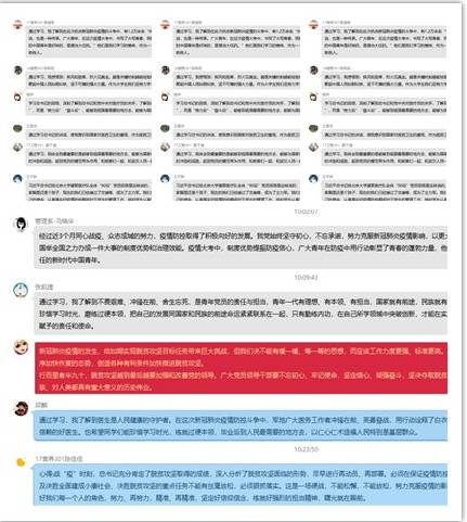 管理系第二黨支部書記馮瑞華表示經過近2個月同心戰(zhàn)疫,我黨始終堅守初心,不忘承諾,努力克服新冠肺炎疫情影響,以更大的決心和更強的力度推進脫貧攻堅。廣大青年在防疫中用行動彰顯了青春的蓬勃力量,他們交出了合格的答卷,是好樣的,是堪當大任的新時代中國青年。張凱捷老師表示作為一名輔導員,應勸勉同學們要珍惜學習時光,磨練過硬本領,把自己的發(fā)展同國家和民族的前途命運緊緊聯系在一起。
