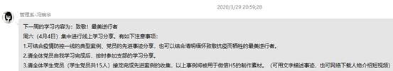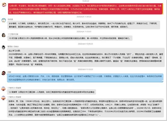 自主學(xué)習(xí)后,馮瑞華同志在支部QQ群中組織支部黨員圍繞學(xué)習(xí)內(nèi)容紛紛發(fā)表學(xué)習(xí)感想。馮瑞華同志表示不能忘記戰(zhàn)“疫”英雄的奉獻(xiàn)和犧牲,以清明節(jié)為契機(jī),重溫戰(zhàn)“疫”英雄的先進(jìn)事跡,感悟其背后的奉獻(xiàn)精神和愛國情懷,用實(shí)際行動向戰(zhàn)“疫”英雄致敬。張眉芳同志表示英雄的祖國,英雄的人民,書寫了人類歷史上可歌可泣的抗疫篇章,慎終追遠(yuǎn),在清明這一特殊時(shí)期,即寄托著血濃于水的同胞之情,也昭示著慨然前行的奮發(fā)之志。王國浩同志表示犧牲在第一線的醫(yī)務(wù)工作者,警察,輔警及志愿者們,用自己的實(shí)際行動詮釋了社會主義建設(shè)者的責(zé)任和擔(dān)當(dāng),他們的先進(jìn)事跡不會被歷史所以往,必將激勵更多的人為抗擊疫情奉獻(xiàn)自我。