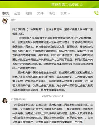 5月7日,管理系第二黨支部依托學(xué)習(xí)強(qiáng)國平臺(tái)開展以“治國理政大家讀”為主題的系列活動(dòng),系統(tǒng)學(xué)習(xí)貫徹黨的十九屆四中全會(huì)精神,更全面、深入的學(xué)習(xí)中國特色社會(huì)主義制度和國家治理體系優(yōu)勢,為決戰(zhàn)決勝脫貧攻堅(jiān)戰(zhàn)和全面建成小康社會(huì)增強(qiáng)制度自信。