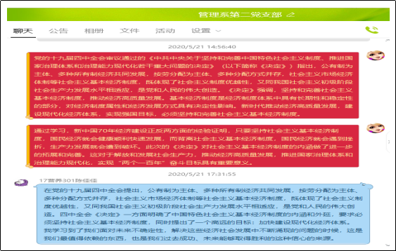5月21日,管理系第二黨支部依托學(xué)習(xí)強(qiáng)國(guó)平臺(tái)學(xué)習(xí)了十九屆四中全會(huì)精神—中國(guó)制度十三講中的第五講:堅(jiān)持和完善社會(huì)主義基本經(jīng)濟(jì)制度,推動(dòng)經(jīng)濟(jì)高質(zhì)量發(fā)展。黨的十九屆四中全會(huì)審議通過(guò)的《中共中央關(guān)于堅(jiān)持和完善中國(guó)特色社會(huì)主義制度、推進(jìn)國(guó)家治理體系和治理能力現(xiàn)代化若干重大問(wèn)題的決定》指出,公有制為主體、多種所有制經(jīng)濟(jì)共同發(fā)展,按勞分配為主體、多種分配方式并存,社會(huì)主義市場(chǎng)經(jīng)濟(jì)體制等社會(huì)主義基本經(jīng)濟(jì)制度,既體現(xiàn)了社會(huì)主義制度優(yōu)越性,又同我國(guó)社會(huì)主義初級(jí)階段社會(huì)生產(chǎn)力發(fā)展水平相適應(yīng),是黨和人民的偉大創(chuàng)造?!稕Q定》強(qiáng)調(diào),堅(jiān)持和完善社會(huì)主義基本經(jīng)濟(jì)制度,推動(dòng)經(jīng)濟(jì)高質(zhì)量發(fā)展?;窘?jīng)濟(jì)制度是經(jīng)濟(jì)制度體系中具有長(zhǎng)期性和穩(wěn)定性的部分,對(duì)經(jīng)濟(jì)制度屬性和經(jīng)濟(jì)發(fā)展方式具有決定性影響。新時(shí)代推動(dòng)經(jīng)濟(jì)高質(zhì)量發(fā)展,建設(shè)現(xiàn)代化經(jīng)濟(jì)體系,實(shí)現(xiàn)強(qiáng)國(guó)目標(biāo),必須堅(jiān)持和完善社會(huì)主義基本經(jīng)濟(jì)制度。