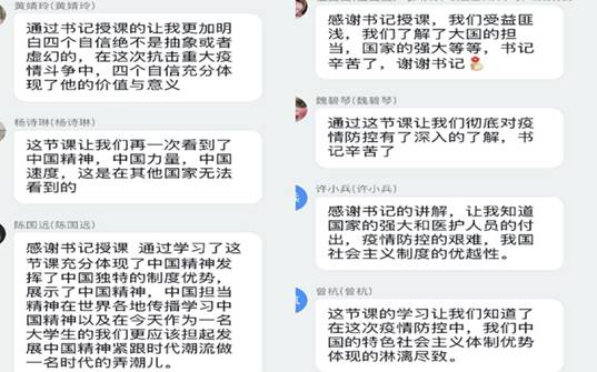 一同聽課的輔導(dǎo)員王開曄說,在這堂疫情防控形勢(shì)政策課堂上,我看到了學(xué)生為獲取知識(shí)而不斷提問的求知心,看到了解疑釋惑后學(xué)生眼睛里流露的堅(jiān)定而自信的光芒,更是第一次看到了學(xué)生在課后依然興奮地討論思政話題。