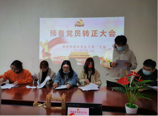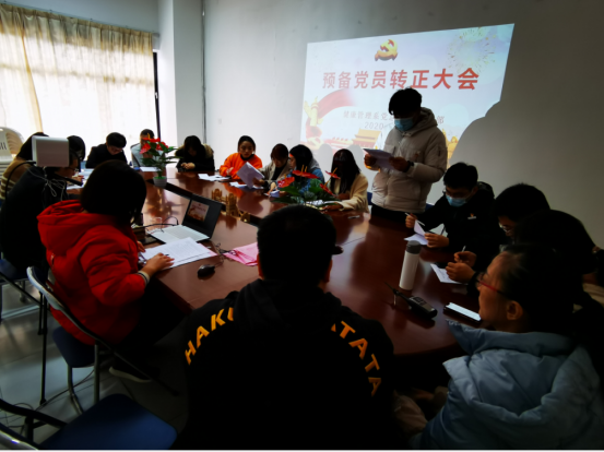 2020年12月24日下午,健康管理系黨總支第二支部在圖書館會議室召開預備黨員轉正大會。會議由支部書記馮瑞華同志主持,支部16名正式黨員同志及6名學生預備黨員參會。