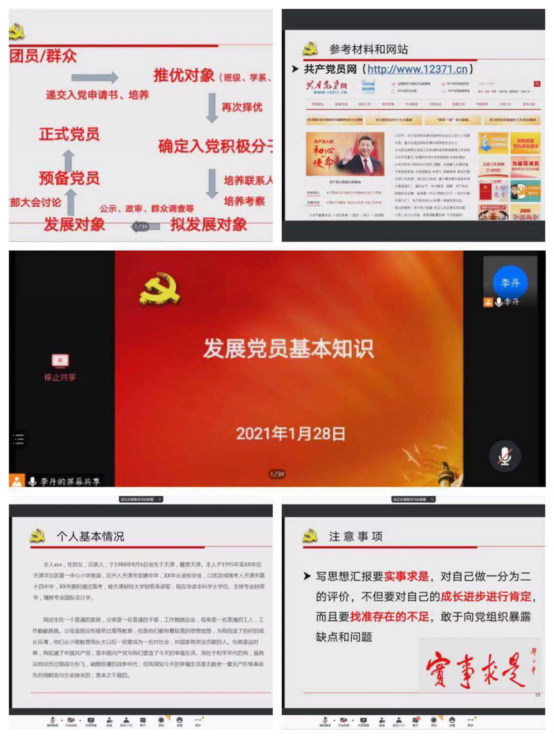 1月28日,健康管理系分黨校在線上開展《發(fā)展黨員基本知識》專題黨課,此次分黨校由李丹老師為全體學(xué)員進行講授。本次黨課旨在通過發(fā)展黨員基本知識的講解來提高學(xué)員的政治素養(yǎng),學(xué)員要時刻明確奮斗目標,永遠跟黨走,牢記使命,為民服務(wù)。