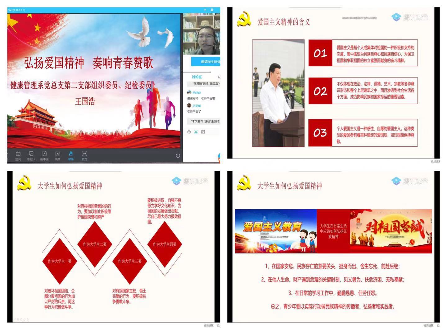 為進(jìn)一步提高入黨積極分子的政治理論水平,強(qiáng)化政治素養(yǎng),把好發(fā)展黨員入口關(guān)。在2021年2月25日上午,健康管理系黨總支第二支部組織委員、紀(jì)檢委員王國浩老師為本期學(xué)員開展了一堂生動的業(yè)余分黨校黨課,旨在通過此次以《弘揚(yáng)愛國精神,奏響青春之歌》為主題的分黨校培訓(xùn)課程,讓分黨校學(xué)員們能夠深深感受到愛國主義精神,增強(qiáng)愛國主義情懷,自強(qiáng)不息,報效祖國。