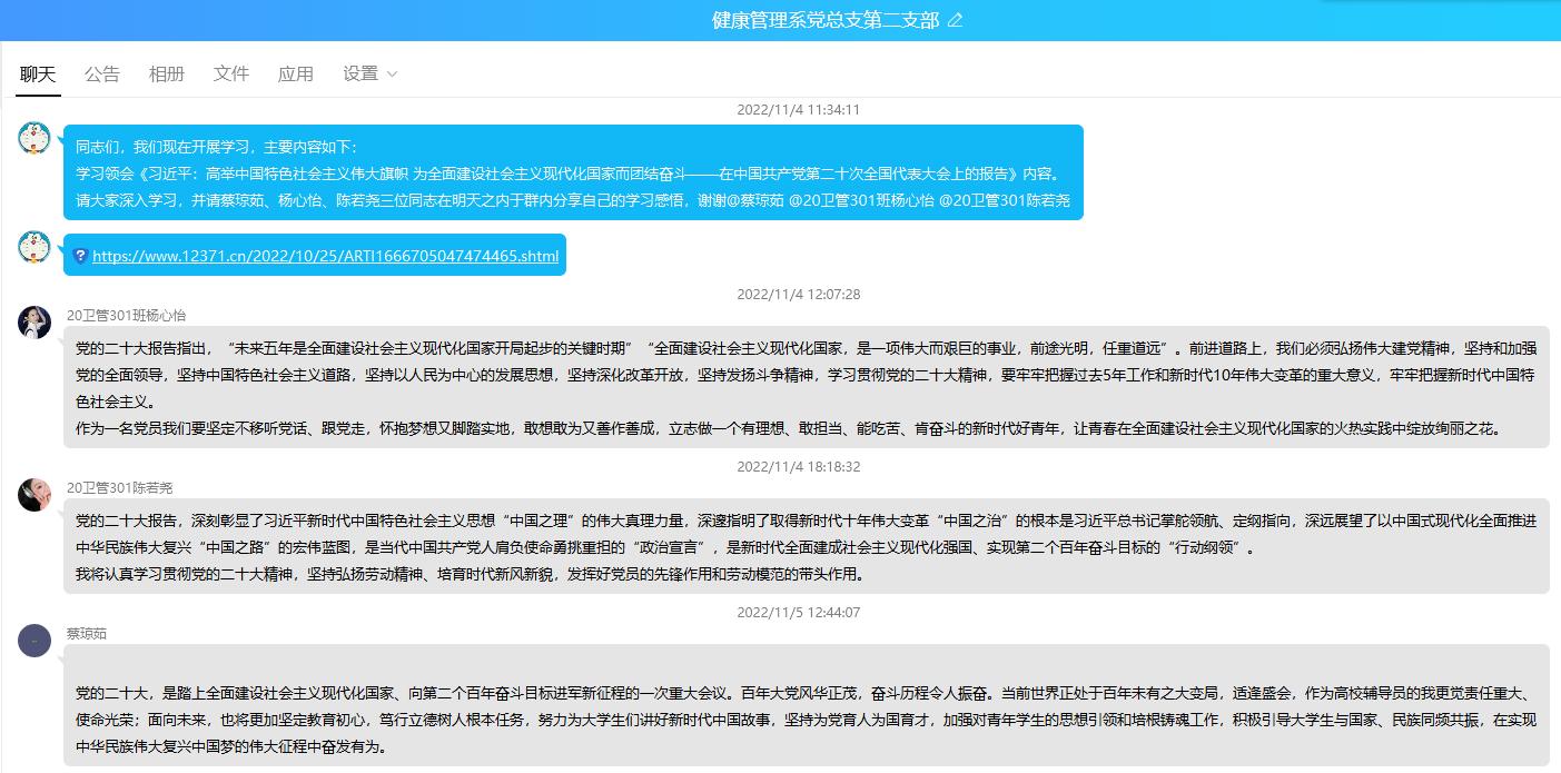 為深入宣傳貫徹黨的二十大精神,2022年11月4日健康管理系黨總支第二支部召開(kāi)學(xué)習(xí)黨的二十大報(bào)告學(xué)習(xí)分享會(huì)議,會(huì)議在線上舉行,會(huì)議由支部書(shū)記張凱捷主持。