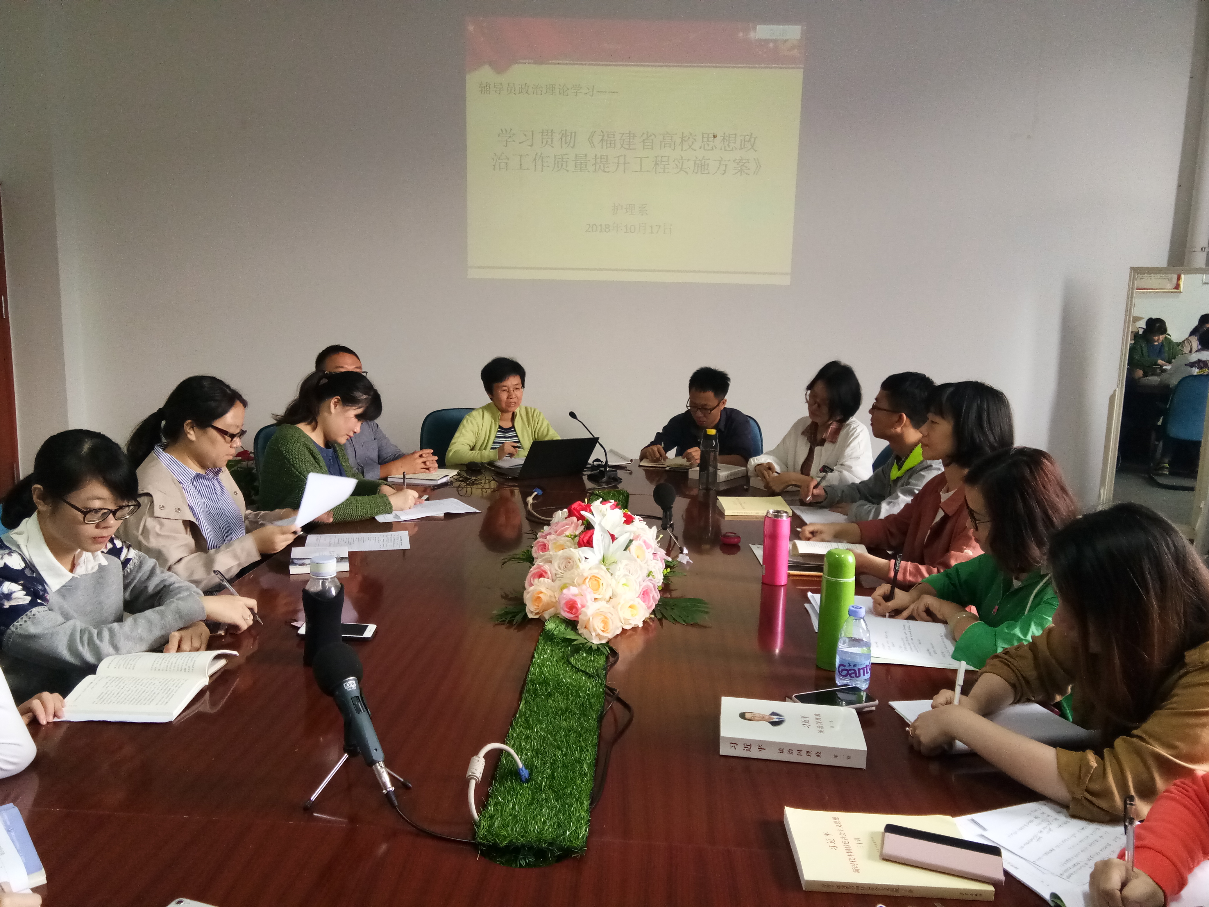 會上謝濤書記帶領(lǐng)全體輔導(dǎo)員認(rèn)真學(xué)習(xí)《福建省高校思想政治工作質(zhì)量提升工程實(shí)施方案》,重點(diǎn)學(xué)習(xí)了《實(shí)施方案》的總體目標(biāo)、基本原則、主要任務(wù)、實(shí)施保障等