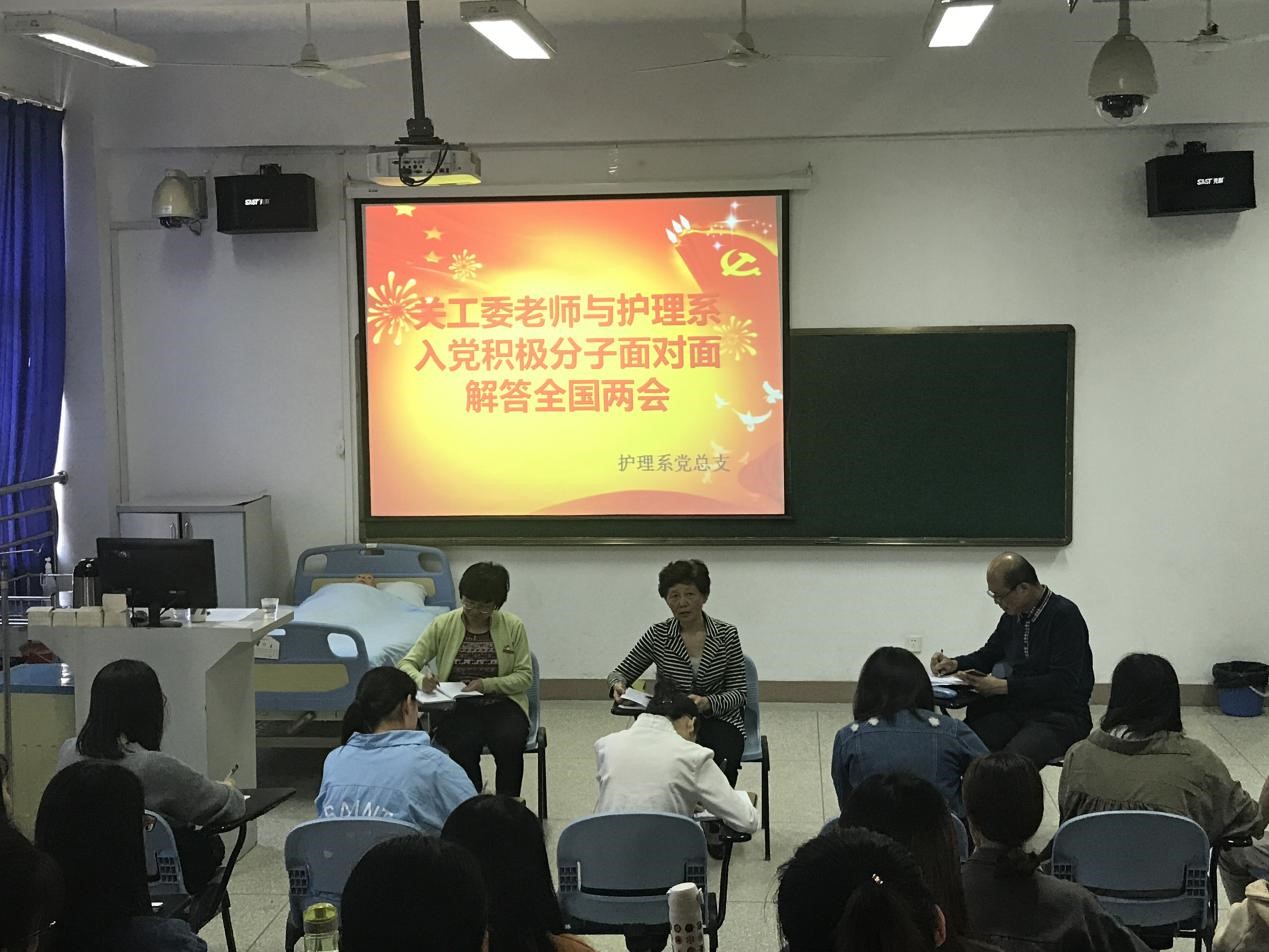 關于制定黨的監(jiān)察法與國際監(jiān)察的有機結合、國務院機構改革、政府工作報告五個方面向護理系入黨積極分子解讀兩會。陳雄副主任通過自身經(jīng)歷以及現(xiàn)代社會經(jīng)濟發(fā)展向入黨積極分子共談兩會。與會入黨積極分子針對兩會提出一系列問題,如編制內(nèi)外的差別、醫(yī)患關系、三醫(yī)結合、養(yǎng)老制度等。嚴肅主任和陳雄副主任耐心一一解答,并期望與會入黨積極分子學好專業(yè)知識,做到知行合一。呼吁入黨積極分子永遠跟黨走,不忘初心、牢記使命,堅定理想信念,積極投身于偉大的護理工作之中,為實現(xiàn)中華民族偉大復興的中國夢不懈奮斗。