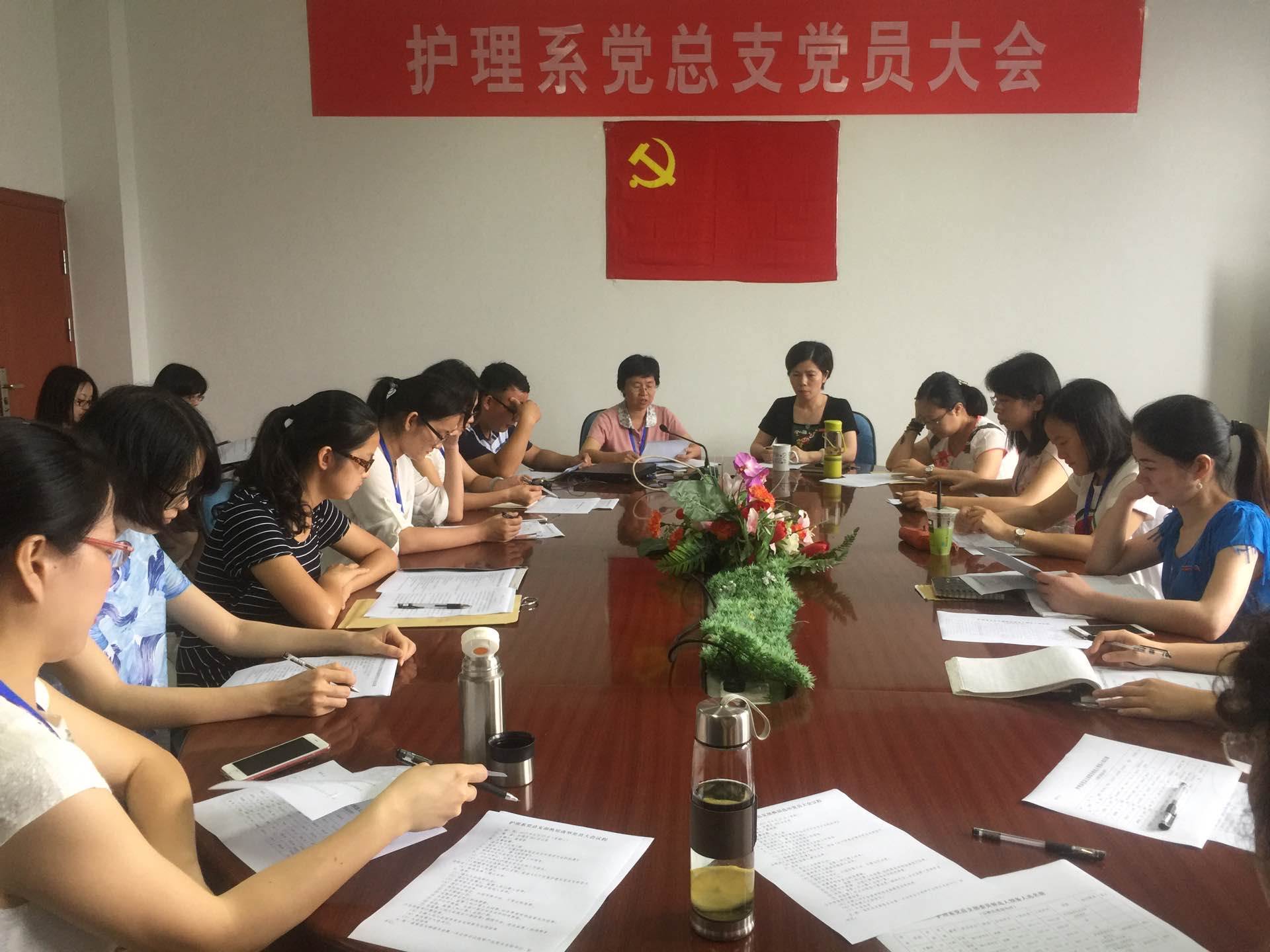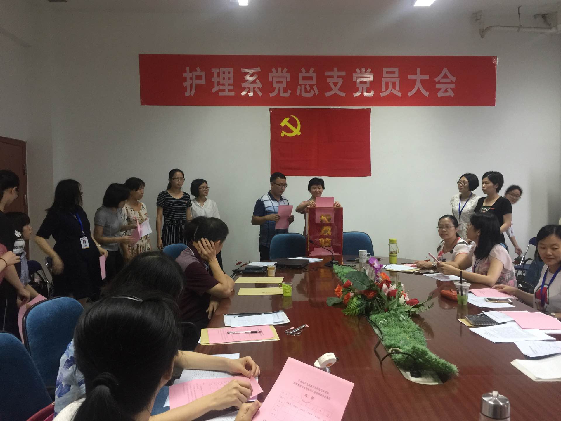大會首先在莊嚴的《國際歌》聲中開始。接著,由謝濤同志代表上一屆護理系黨總支委員會向大會作了工作報告,對上一屆委員會工作進行總結,提出新一屆黨總支委員會的工作目標任務及實施措施,同時報告黨費收繳和使用情況。林桂松宣讀學院黨委關于護理系總支委員會換屆選舉候選人的批復。會議表決通過了大會選舉辦法和選舉工作人員名單,經全體正式黨員投票選舉,許慧瓊、陳雪珍、林桂松、賈箐箐和謝濤五名同志當選為護理系新一屆黨總支委員會委員。隨后,新一屆委員會召開第一次全體委員會議,選舉謝濤同志為黨總支書記,林桂松同志為黨總支副書記,討論并擬訂了黨總支委員分工。