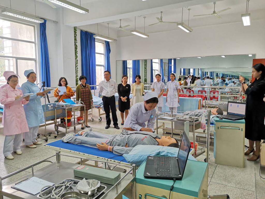 11月7日,學(xué)院黨委曾武祈書記在護(hù)理系黨總支謝濤書記、護(hù)理系龔海蓉副主任的陪同下再一次來到護(hù)理系實(shí)訓(xùn)室訓(xùn)練現(xiàn)場(chǎng)看望慰問正在備戰(zhàn)全省護(hù)理職業(yè)技能大賽的精準(zhǔn)扶貧班參賽選手。