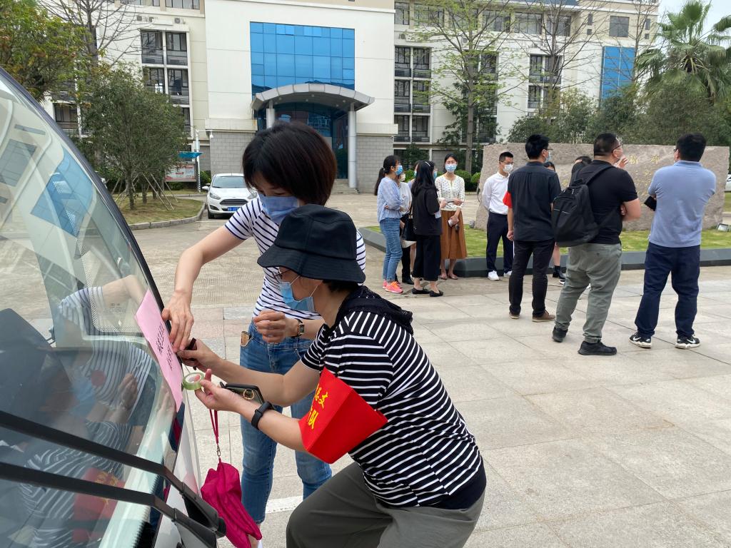 護理系黨總支黨員突擊隊隊長謝濤為接送學生車輛粘貼車標