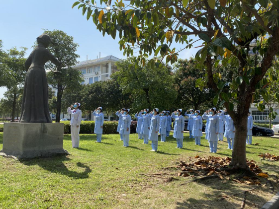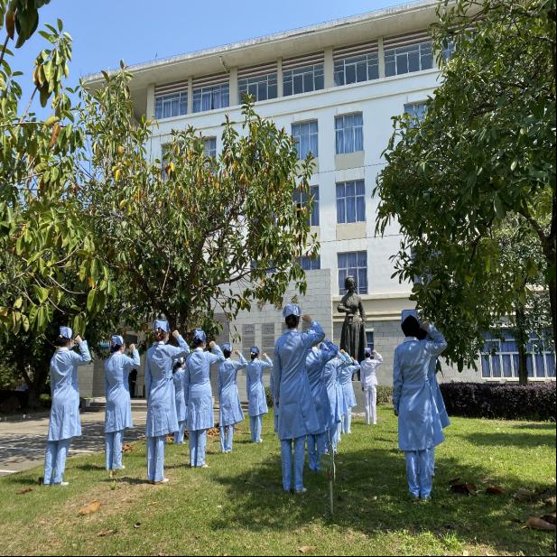 “我宣誓,我志愿獻(xiàn)身護(hù)理事業(yè),熱愛護(hù)理專業(yè),謹(jǐn)奉人道主義精神,堅(jiān)定救死扶傷的信念……”4月29日上午,福建省支援湖北第八批醫(yī)療隊(duì)員、2016年畢業(yè)于我院護(hù)理專業(yè)的援鄂校友陳雨雯莊嚴(yán)肅立,帶領(lǐng)護(hù)理系教師代表在護(hù)理系辦公樓南丁格爾雕像前領(lǐng)銜宣讀護(hù)士生誓詞,站在她身后的不少老師都曾是陳雨雯在校期間的老師,老師們看著領(lǐng)誓的陳雨雯,不禁升騰起護(hù)理教育工作者的自豪之情。