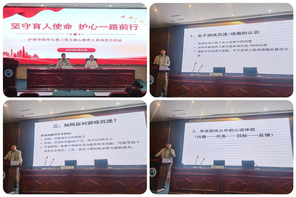五月,是青春的季節(jié),也是成長的季節(jié)。在這個(gè)充滿活力與希望的月份里,護(hù)理學(xué)院學(xué)生第三黨支部聯(lián)合護(hù)理學(xué)院護(hù)心苑精心策劃并舉辦了心理育人系列黨日活動(dòng),旨在通過專家講座和多彩活動(dòng),為學(xué)生提供心理支持和幫助,引導(dǎo)他們健康成長。本次系列活動(dòng)不僅邀請(qǐng)了三位心理學(xué)領(lǐng)域?qū)<?,還精心策劃了多項(xiàng)富有創(chuàng)意的實(shí)踐活動(dòng),旨在通過理論與實(shí)踐相結(jié)合的方式,為學(xué)生們提供全面而深入的心理健康教育。