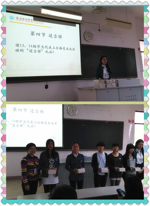本次活動(dòng)主要分為兩個(gè)環(huán)節(jié)。第一環(huán)節(jié)于10月30日晚6:30在學(xué)術(shù)廳聘請福建農(nóng)林大學(xué)馬克思主義學(xué)院副書記、副院長劉新玲教授進(jìn)行《公共生活中的道德》講座;第二環(huán)節(jié)分以歌唱《公民道德歌》、朗讀《公民道德三字經(jīng)》、談聆聽講座的感悟、送吉祥(發(fā)放小禮品)、行善舉(請同學(xué)們課后在校園里行一個(gè)善舉)這五個(gè)環(huán)節(jié)來進(jìn)行。