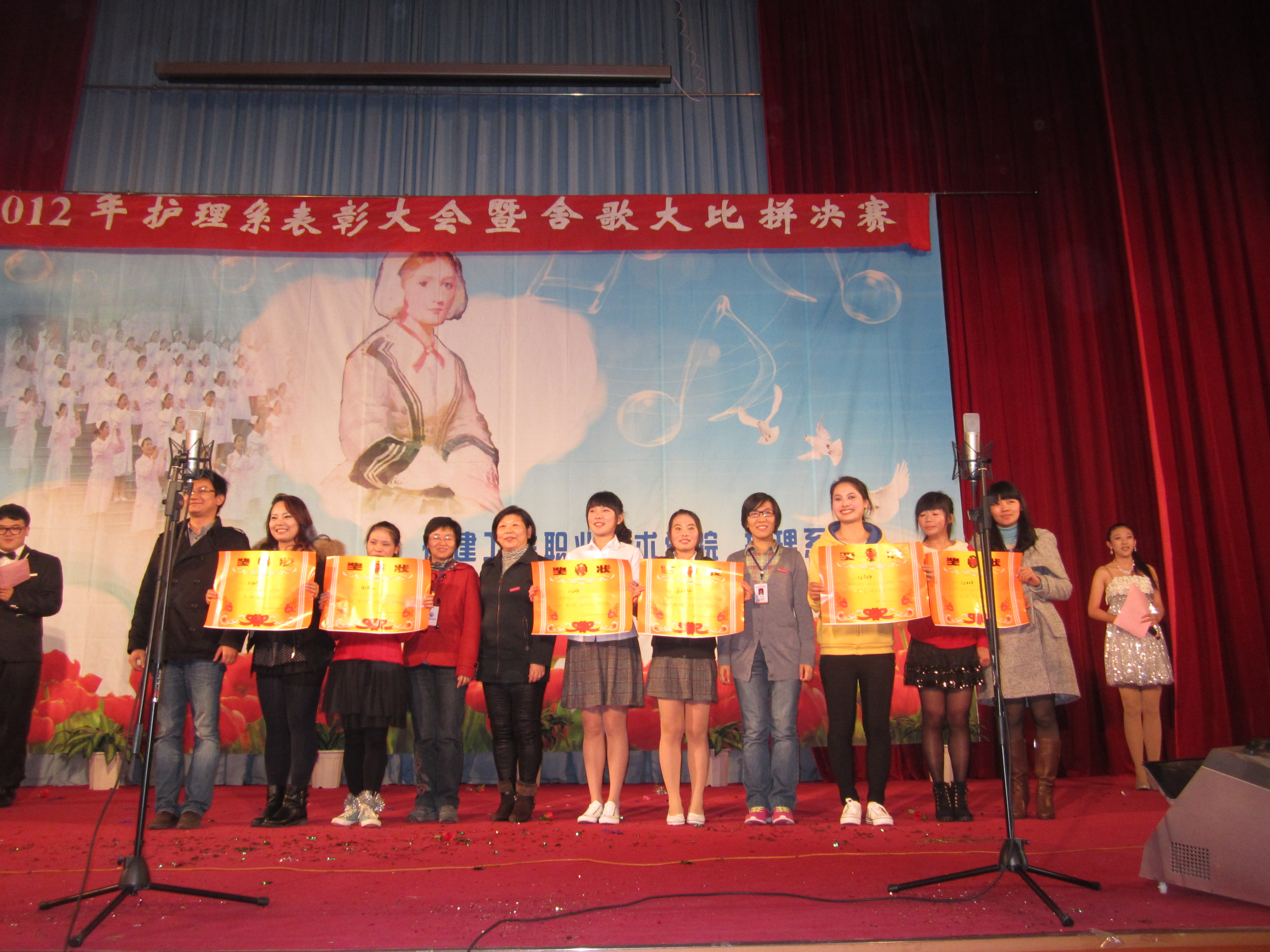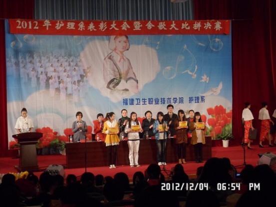 2012年12月4日晚6:30,福建衛(wèi)生職業(yè)技術(shù)學(xué)院護(hù)理系團(tuán)總支、學(xué)生會(huì)在學(xué)術(shù)廳共同舉辦2012年護(hù)理系表彰大會(huì)暨第三屆舍歌大比拼決賽。蒞臨本次活動(dòng)的領(lǐng)導(dǎo)及嘉賓有學(xué)院魏立娜副院長(zhǎng)、護(hù)理系鄭翠紅主任、護(hù)理系黨總支謝濤書記、院團(tuán)委宋維副書記、院團(tuán)委董東老師、護(hù)理系團(tuán)總支書記林媛老師、各系團(tuán)總支負(fù)責(zé)人及護(hù)理系全體輔導(dǎo)員。大會(huì)對(duì)先進(jìn)集體、先進(jìn)個(gè)人進(jìn)行了表彰,魏副院長(zhǎng)的講話充分肯定了同學(xué)們獲得的成績(jī),并對(duì)全系師生寄予厚望。