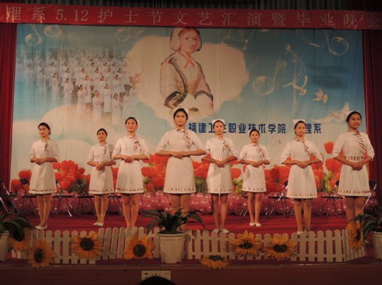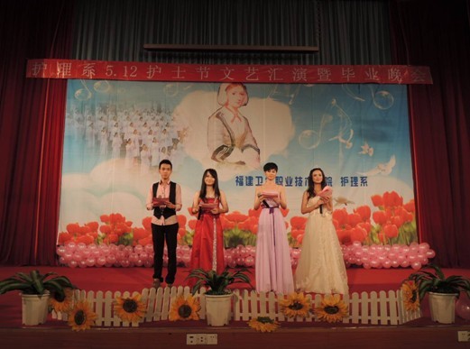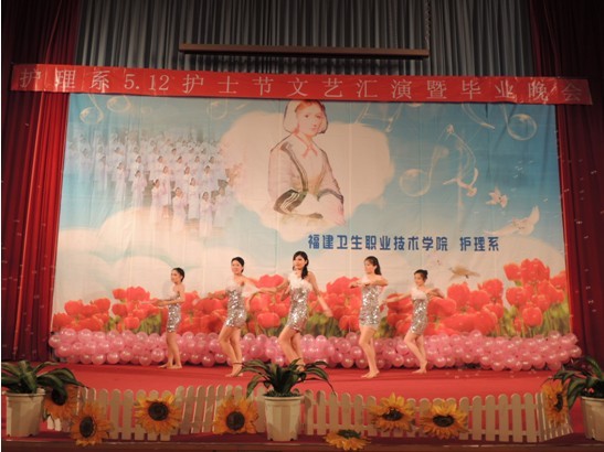 福建衛(wèi)生職業(yè)技術(shù)學院護理系于2013年5月7日晚7:00在學術(shù)廳迎來了5.12護士節(jié)文藝匯演暨畢業(yè)晚會。院黨委陳雄副書記、黃開良副院長、魏立娜副院長、學生工作處黃銘珊處長、護理系黨總支謝濤書記、院團委宋維副書記及各系團總支書記、老師、輔導員蒞臨了本次晚會。