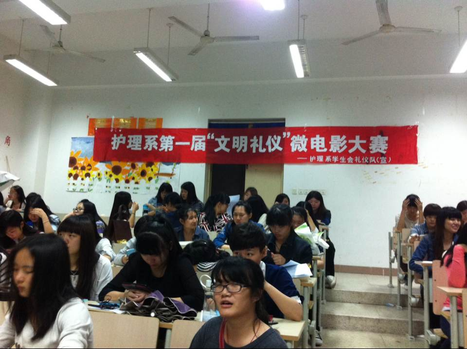為豐富同學(xué)們的課余生活,展現(xiàn)我校大學(xué)生健康向上、文明、環(huán)保的精神風(fēng)貌,在我系領(lǐng)導(dǎo)的支持與關(guān)心下,在同學(xué)們的熱情關(guān)注下,由護(hù)理系學(xué)生會(huì)主辦的以“文明禮儀”為主題的微電影比賽于4月10日19:30-21:20在教學(xué)樓214拉開帷幕。