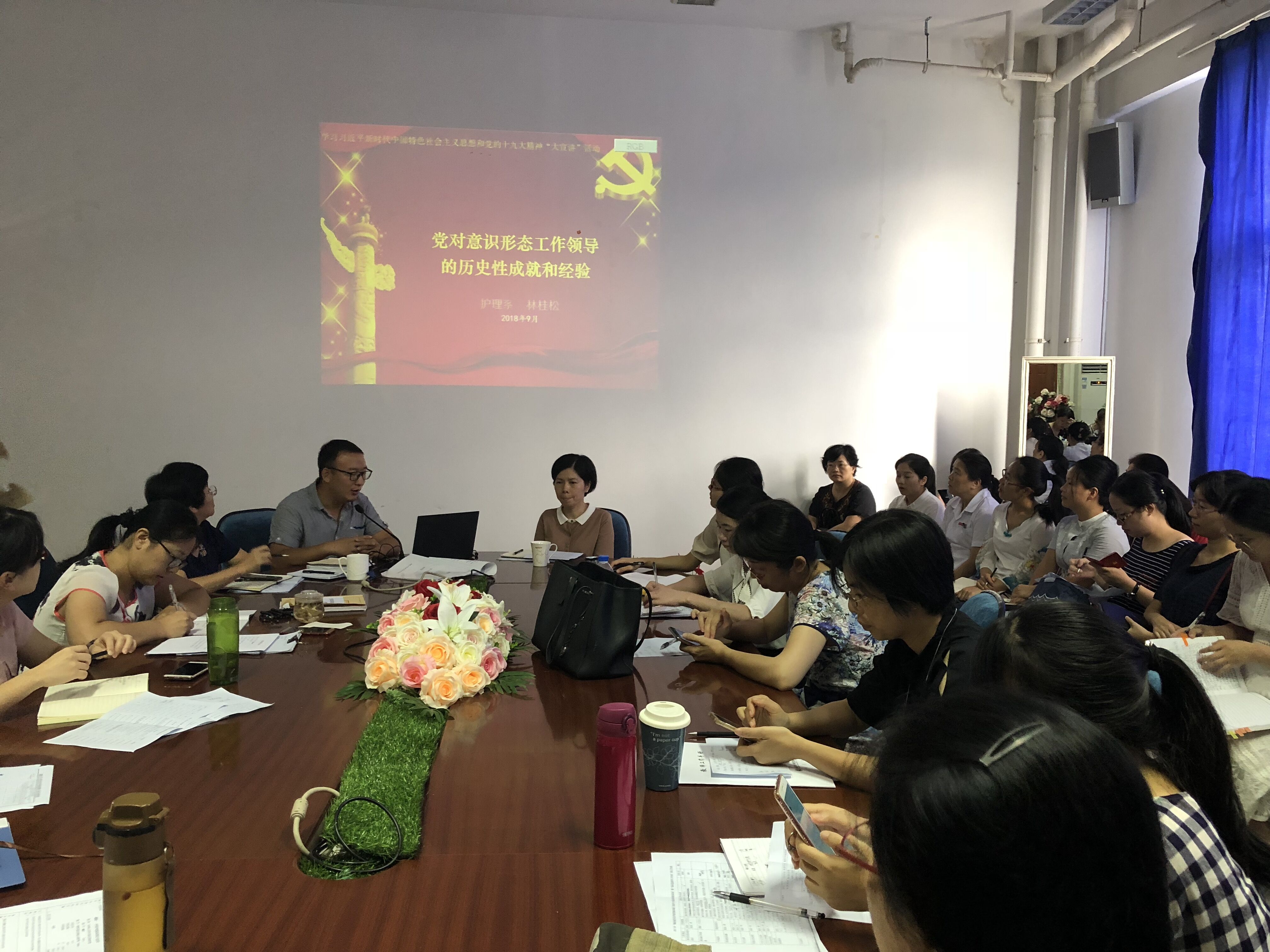 為深入學(xué)習(xí)貫徹習(xí)近平新時(shí)代中國特色社會(huì)主義思想和黨的十九大精神,按照學(xué)院《開展習(xí)近平新時(shí)代中國特色社會(huì)主義思想“大宣講”工作方案》的要求與安排,9月13日下午,護(hù)理系在301會(huì)議室舉辦專題黨課,護(hù)理系林桂松副書記為護(hù)理系全體黨員干部職工做了以“黨對意識(shí)形態(tài)工作領(lǐng)導(dǎo)的歷史成就和經(jīng)驗(yàn)”為專題的黨課,護(hù)理系全體教職工認(rèn)真聽取的黨課。