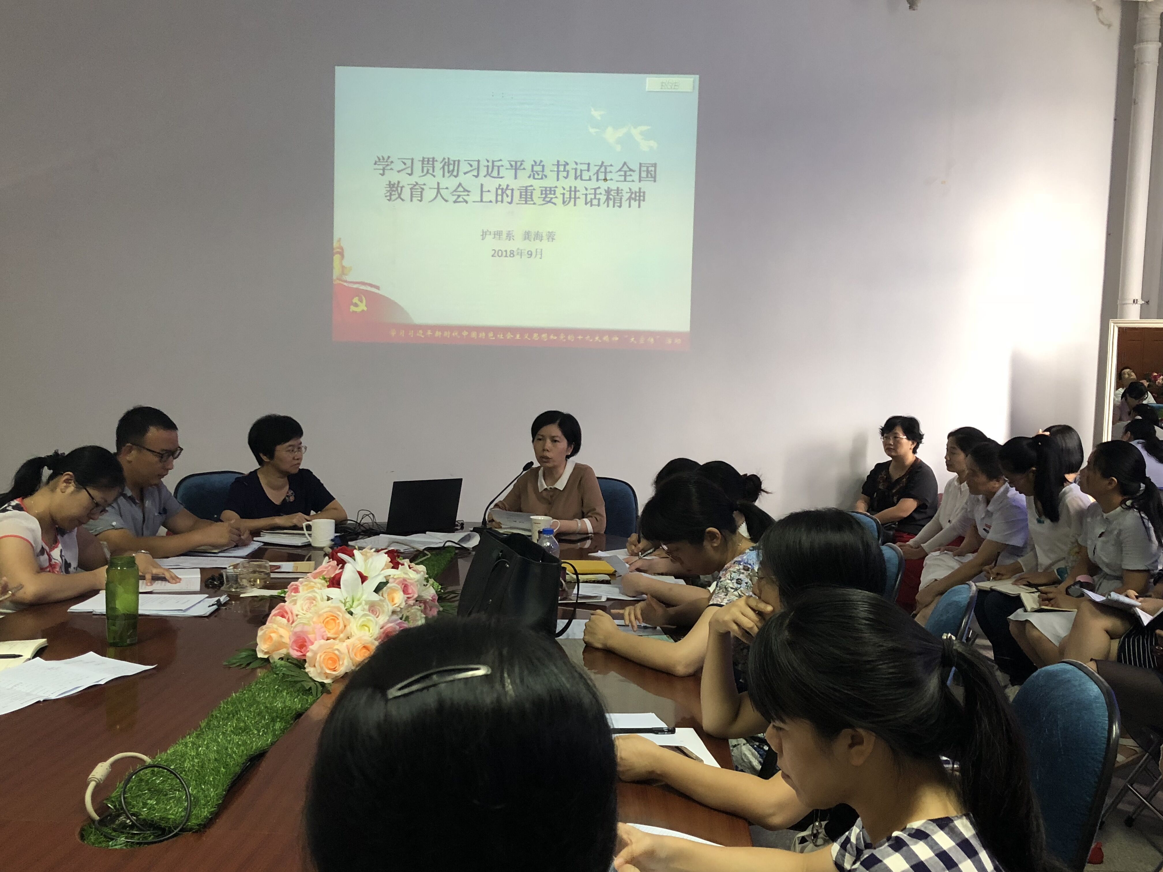 日,護(hù)理系學(xué)習(xí)習(xí)近平總書記在全國(guó)教育大會(huì)上的重要講話精神會(huì)議在護(hù)理系三樓會(huì)議室召開(kāi),會(huì)議由護(hù)理系龔海蓉主任主講,我系全體教職工參加。