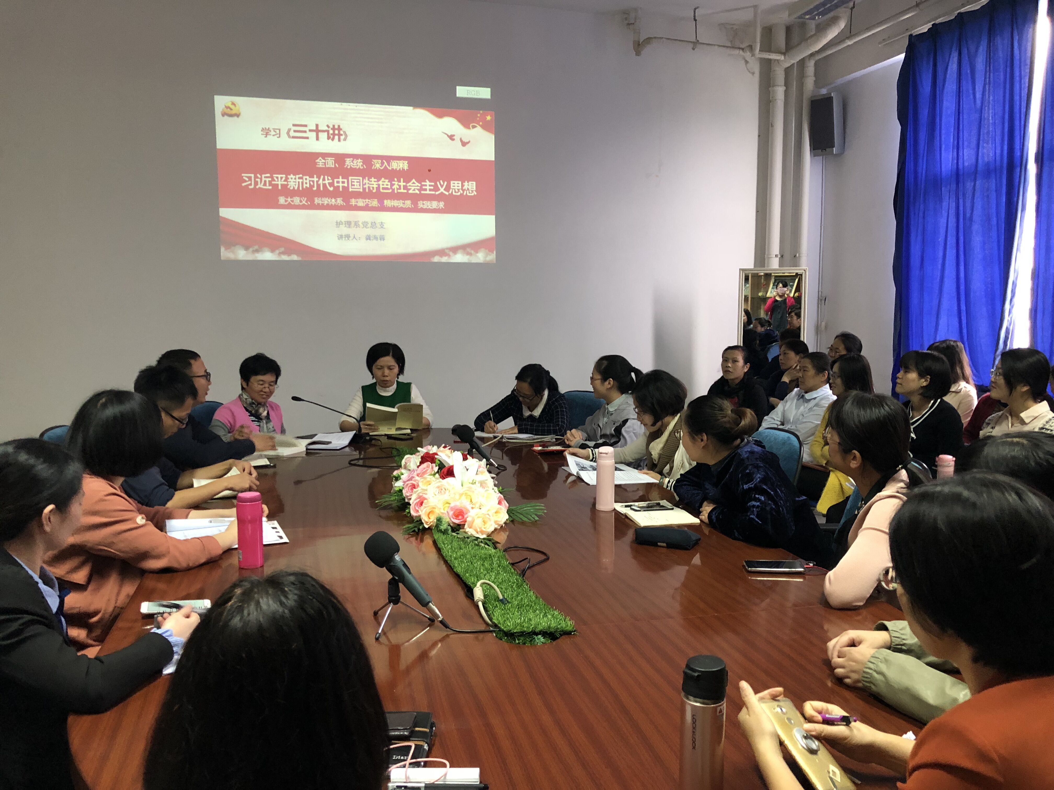 為深入貫徹落實(shí)習(xí)近平新時代中國特色社會主義思想和黨的十九大精神,2018年10月18日下午,護(hù)理系在301會議室集中學(xué)習(xí)了《習(xí)近平新時代中國特色社會主義思想三十講》的第一講,護(hù)理系龔海蓉副主任主持并講授,護(hù)理系全體教職工參加集中學(xué)習(xí)。