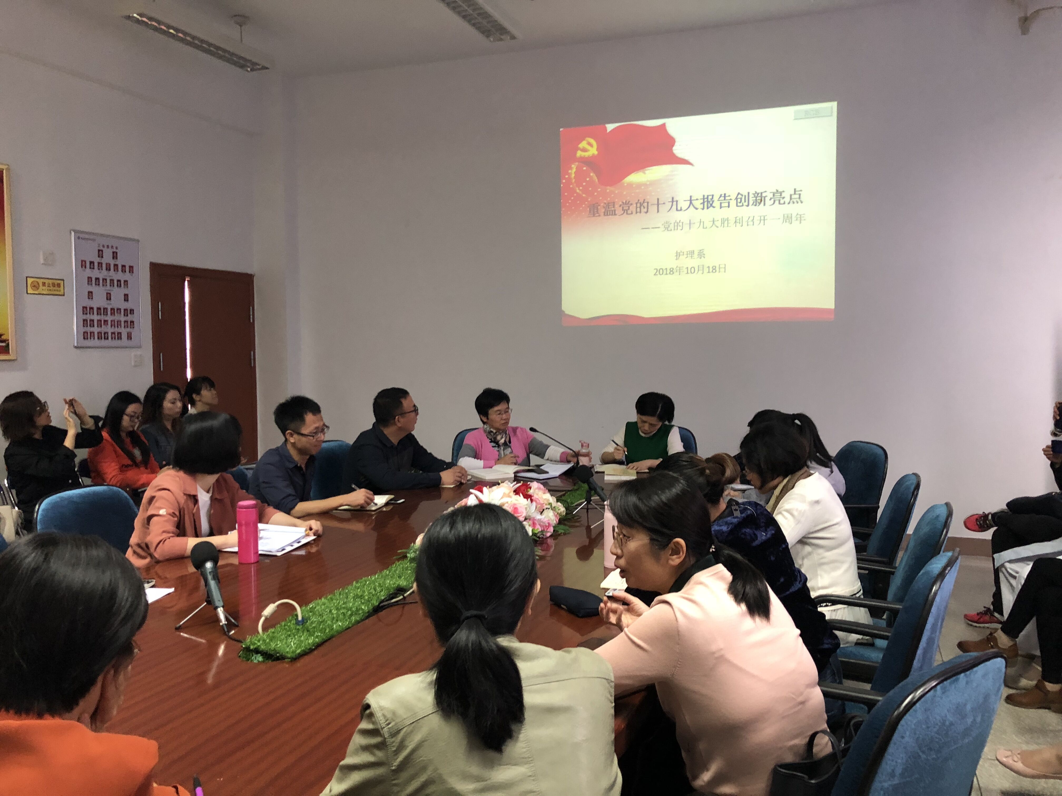 黨的十九大報(bào)告是習(xí)近平新時(shí)代中國(guó)特色社會(huì)主義思想的集大成,實(shí)現(xiàn)了黨的指導(dǎo)思想的與時(shí)俱進(jìn),處處閃耀著創(chuàng)新和發(fā)展馬克思主義的真理光芒。為紀(jì)念黨的十九大勝利召開(kāi)一周年,立足于一周年的時(shí)間節(jié)點(diǎn),護(hù)理系于301會(huì)議室進(jìn)行了題為“重溫黨的十九大報(bào)告創(chuàng)新亮點(diǎn)——黨的十九大勝利召開(kāi)一周年”的專(zhuān)題黨課學(xué)習(xí)。此次專(zhuān)題黨課有護(hù)理系謝濤書(shū)記主持并講授,護(hù)理系全體教職工參與學(xué)習(xí)。