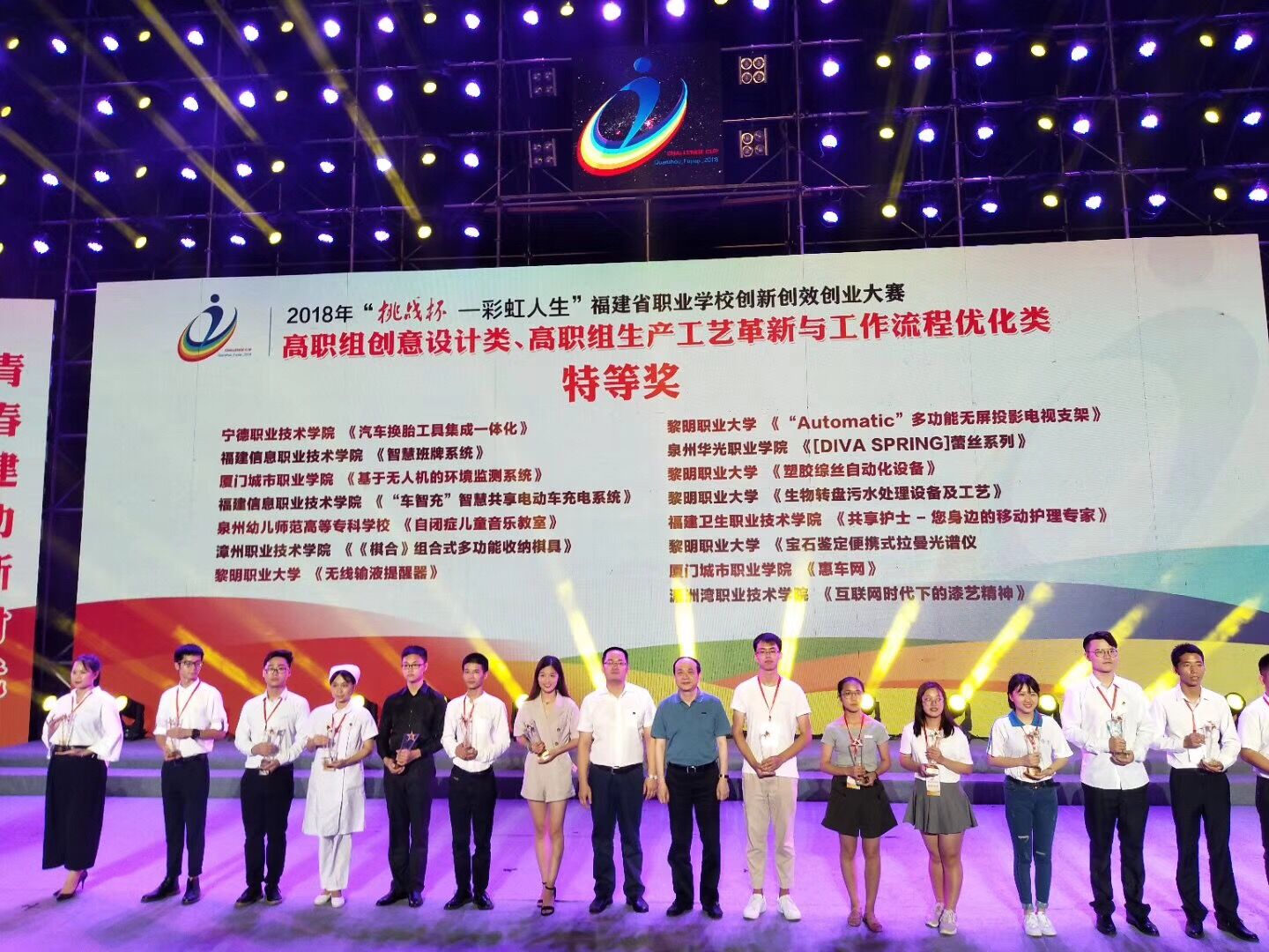本次大賽由共青團(tuán)福建省委、福建省教育廳、福建省人力資源和社會(huì)保障廳、福建省科學(xué)技術(shù)協(xié)會(huì)、福建省學(xué)生會(huì)聯(lián)合會(huì)共同舉辦,黎明職業(yè)大學(xué)、共青團(tuán)泉州市委承辦。從來自全省35所職業(yè)學(xué)校共計(jì)189件作品中評(píng)選出92件作品入圍終審決賽。我系《共享護(hù)士——您身邊的移動(dòng)護(hù)理專家》作品入圍決賽,并經(jīng)過作品展示、陳述答辯環(huán)節(jié)的激烈角逐,最終在本屆大賽中榮獲特等獎(jiǎng),并取得了代表福建省參加國賽的資格。