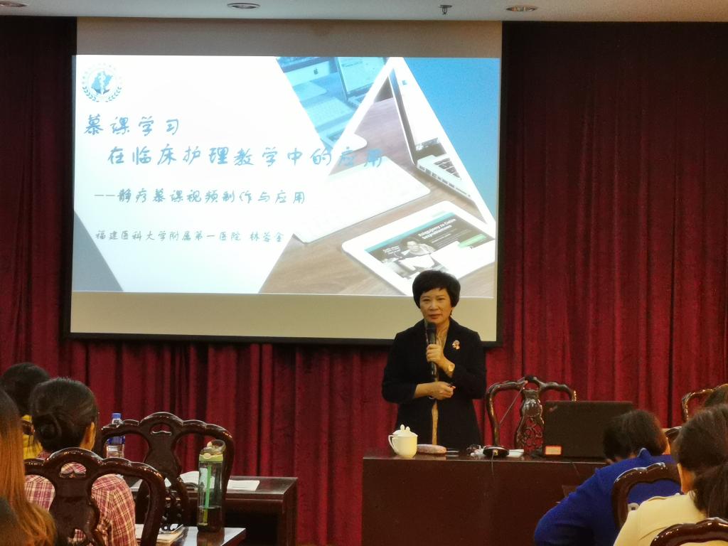 福建醫(yī)科大學(xué)附屬第一醫(yī)院護(hù)理部主任、福建省護(hù)理學(xué)會(huì)副理事長(zhǎng)林蓉金主任做了《慕課學(xué)習(xí)在臨床護(hù)理教學(xué)中的應(yīng)用》的講座。她以靜療慕課視頻制作與應(yīng)用為例,從自身長(zhǎng)期臨床護(hù)理經(jīng)驗(yàn)出發(fā),從慕課的特點(diǎn)、慕課學(xué)習(xí)與臨床教學(xué)、慕課課程制作步驟三方面詳細(xì)地分享了慕課學(xué)習(xí)在臨床護(hù)理教學(xué)中的應(yīng)用成效,為學(xué)員們?yōu)楦髯葬t(yī)院的護(hù)理教學(xué)基地建設(shè)提供豐富的實(shí)戰(zhàn)經(jīng)驗(yàn)。