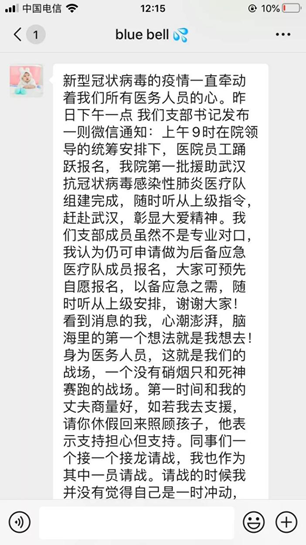 2020年1月26日13.25分接到科室需派人員奔赴武漢支援的消息,立馬就報(bào)了名。還未曾向父母打過(guò)招呼,我想。就算你們反對(duì),我也要去。意料之中,我的父母是反對(duì)的。他們沒(méi)有想過(guò)這只有電視里得情景居然就發(fā)生了,發(fā)生在他們的身邊。發(fā)生在他們最親人的身上。表明我肯定態(tài)度之后,終究是松口了。